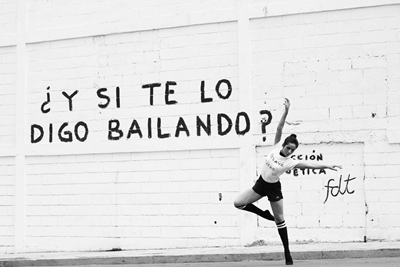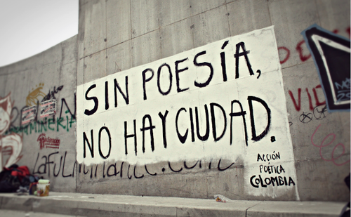 C’est sur un mur que tout se déroule. Peint en blanc, le mur qui sert de support accueille une phrase courte, écrite en lettres majuscules. Dans la partie inférieure à droite, la signature “Acción Poética”. Partout dans le monde “toutes les poésies” ont ce patron en commun. Parfois, les peintres appelés “accionistas” tendent à insérer le nom de leur ville.