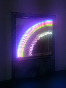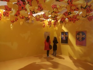 En guise de fond sonore, la candeur des chansons de France Gall s’entremêle au vacarme des publicités de maquillage presque oppressantes des sixties. L’exposition recèle aussi d’œuvres plus ironiques représentant, avec toujours autant de couleurs et de gaité visuelle, l’accumulation d’objets banals attribués par les plus conservateurs à la femme, comme les ustensiles de cuisine et les produits de beauté.