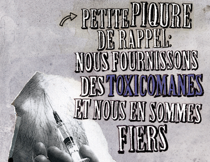 Slogan de communication, de l’association « Aides », à l’égard des préjugés sur la réduction des risques, “petite piqure de rappel : nous fournissons des toxicomanes et nous sommes fiers”
