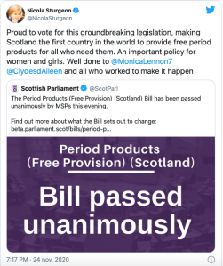 « C’est un jour de fierté pour l’Ecosse et un signal au monde qu’il est possible de mettre en place un accès universel gratuit aux protections périodiques », a alors déclaré Monica Lennon après le résultat du vote. La première ministre Nicola Sturgeon a elle twitté : « C’est une fierté d’avoir voté pour cette loi révolutionnaire, qui fait de l’Ecosse le premier pays au monde à fournir des protections périodiques gratuites à toutes celles qui en ont le besoin ». Le coût de la mesure est estimé à 9,7 millions de livres, soit environ 11 millions d’euros par an. En 2018, l’écosse été devenu le premier pays à distribuer gratuitement des protections périodiques dans les écoles et les universités. Pour Monica Lennon, « il s’agit de produits de base, et pas une seule femme en Ecosse ne devrait avoir à vivre sans protection périodiques ». Selon l’ONG Plan International, au Royaume-Unis, 10 % des femmes ont déjà été dans l’impossibilité d’acheter des produits hygiéniques.