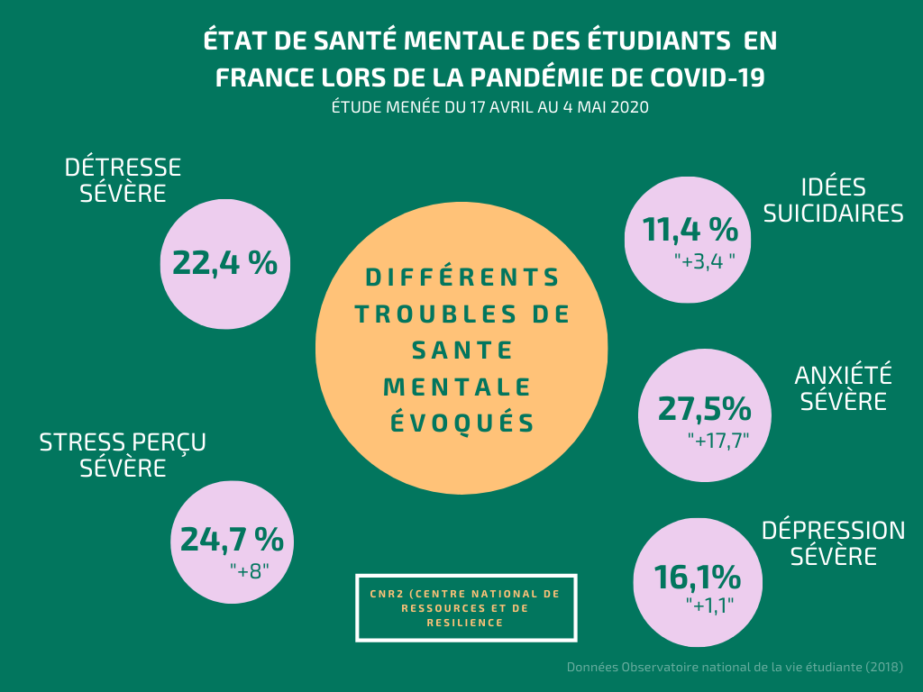 Une étude menée par le Centre National de Ressources et de Résilience (CN2R) du 17 avril au 4 mai 2020 montre clairement la dégradation de la santé mentale des étudiants depuis la pandémie de Covid. Sur un échantillon de 69 054 étudiants de 20 ans en moyenne, 11,4 % des interrogés ont eu des idées suicidaires au cours des douze derniers mois en France.