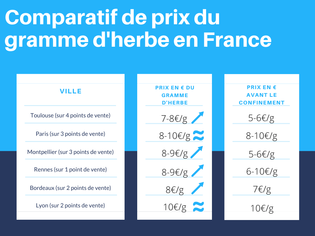 L’Observatoire Français des Drogues et des Toxicomanies (OFDT) précise dans une étude récente que la France est l’un des pays les plus consommateurs de cannabis. En 2018, elle se trouvait au dixième rang en Europe. Cette substance illicite est bien connue des plus jeunes. En 2017, 33,1 % des lycéens avouent avoir déjà essayé. Un chiffre édifiant qui questionne sur le coût de cette consommation. Pour 67,1 % des usagers de 17 ans, la substance leur est fournie gratuitement par le biais de consommations partagées. Pour ceux qui achètent, 56,9 % se fournissent via un réseau d’amis et de proches et 44,8 % via un revendeur habituel. En moyenne, en 2018, le gramme d’herbe coûtait 10€ selon l’Office Central de la Répression du Trafic Illicite des Stupéfiants (OCRTIS). Un prix qui varie en fonction des régions et qui connaît une hausse générale depuis le confinement. Après une étude de plusieurs points de vente, nous avons pu évaluer le prix moyen ainsi que la hausse observée après le confinement dans plusieurs régions.