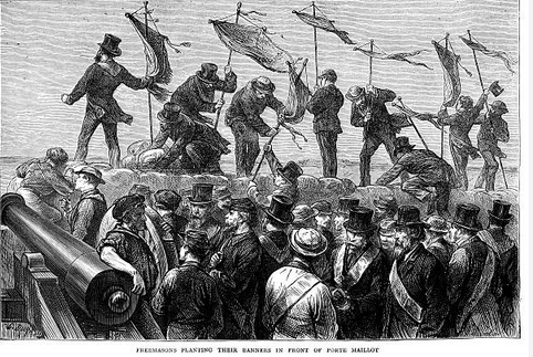 Les Francs-Maçons sur les remparts de la Porte Maillot le 29 avril 1871, espéraient pouvoir ramener la paix entre les factions en négociant avec les initiés Versaillais. Gravure Franc-Maçonnerie et Histoire de France