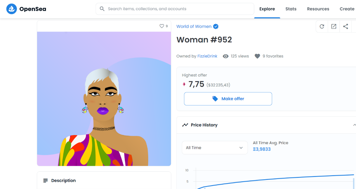 Mais c’est aussi le cas de l’art numérique qui voit son marché prendre un tournant majeur. Les œuvres créées par des logiciels qui étaient jusqu’à présent plus difficiles d’accès qu’une œuvre physique, vont pouvoir trouver leur public et gagner en visibilité. Mais des œuvres physiques sont aussi détournées pour devenir intégralement numériques. Comme la gravure « Morons » de Banksy qui a été brûlée durant une performance d’Injective Protocol afin de n’exister que sur le web et d’être vendue grâce aux NFT. Et le site OpenSea est la preuve même que ce marché est l’avenir de l’art numérique. Sur cette plateforme, des milliers de créateurs et d’artistes vendent et collectent des œuvres purement numériques. Pour les plus nostalgiques, c’est un peu comme des cartes Pokémon finalement. Collectionner des biens uniques et se les « échanger » entre amateurs. Se balader sur OpenSea, c’est comme visiter une galerie d’art. La vente fonctionne comme une enchère avec des offres. Voici un exemple d’une œuvre uniquement numérique mise en vente sur OpenSea.