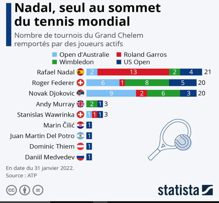 « C’est phénoménal, c’est fait pour Nadal ! Il devient le plus grand en Grand Chelem. Un des plus grands exploits de l’histoire du tennis ! Il n’y a pas de mots, c’est hallucinant ». Voici les termes du commentateur d’Eurosport France, Bertrand Milliard à l’issue de la balle de match de la finale de l’Open d’Australie 2022. Avec ce succès, Nadal repousse les limites de son sport et devient le joueur le plus titré en Grand Chelem. Cet exploit est d’autant plus retentissant avec le scénario insensé de cette finale face au russe Daniil Medvedev, numéro 2 mondial et pourtant favori. Le Majorquin était mené 2 manches à 0 et 3-2 dans le 3e set. Mais il a su revenir avec la combativité qui le caractérise. Rafael Nadal est le premier joueur à remporter le titre de l’Open d’Australie avec un déficit de deux manches en finale depuis Roy Emerson en 1965. Un autre fait d’armes pour l’espagnol, il concourt dans l’ère la plus compétitive de l’histoire du tennis, ce que beaucoup d’experts considèrent comme l’Âge d’Or de ce sport. Son immense rivalité avec Roger Federer et Novak Djokovic, deux joueurs légendaires en est l’illustration parfaite, et pourtant « Rafa » les devance dans bon nombre de statistiques.