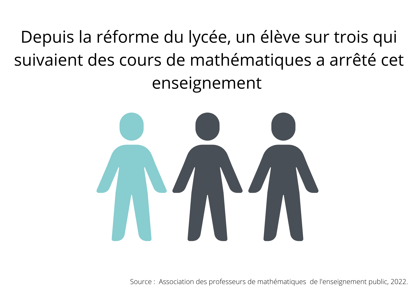 Par rapport aux dernières années, les lycéens sont moins nombreux à suivre des cours de mathématiques. 59 % des élèves de terminale étudient encore les mathématiques, contre 90 % avant la réforme du lycée, indique l’association des professeurs de mathématiques de l’enseignement public. Pour cette matière, les professeurs ont perdu un élève sur trois.
