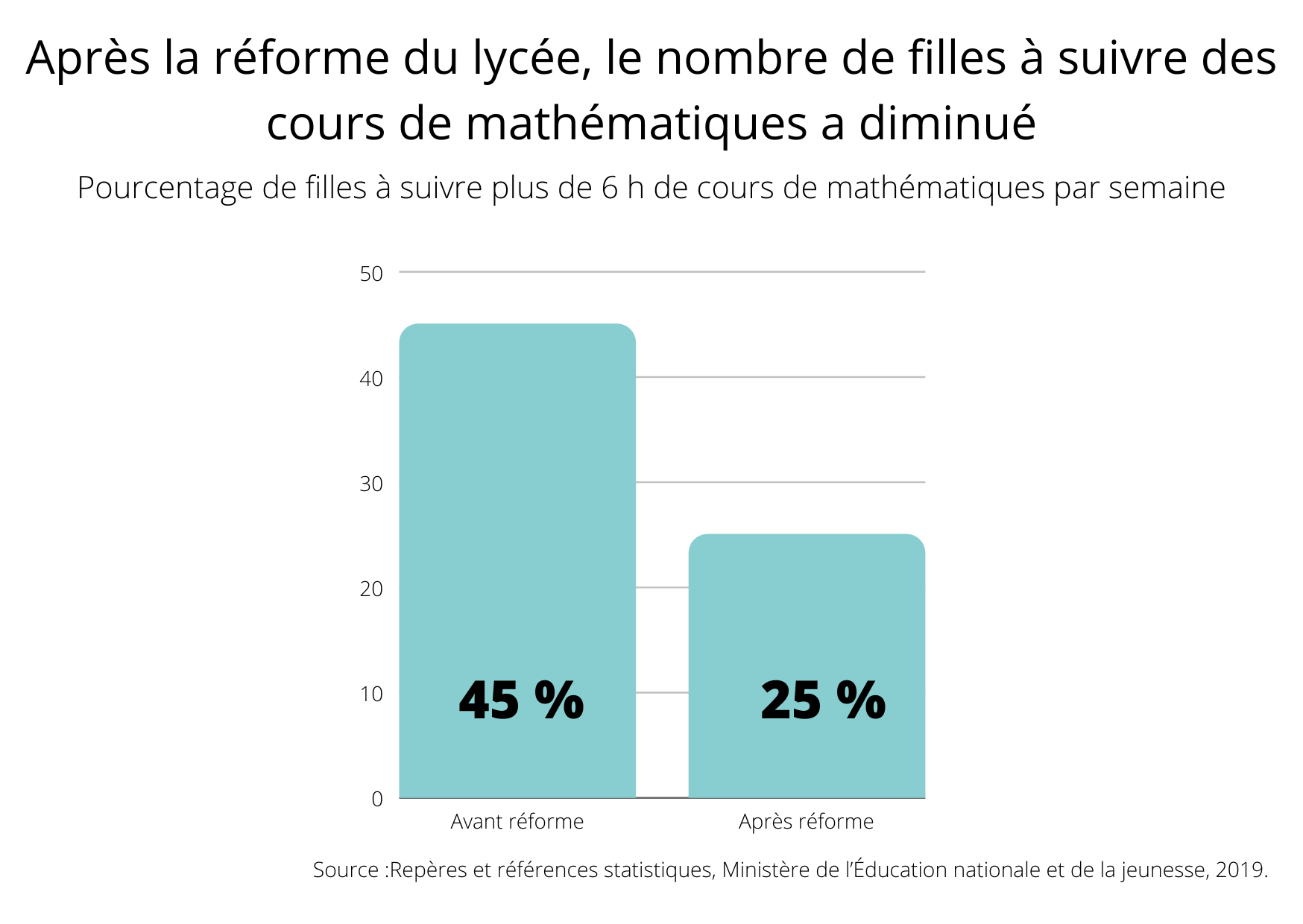 La société mathématique de France a fait savoir dans son communiqué du 25 janvier que «seulement 25% des filles en 2021 ont un enseignement de mathématiques de plus de 6 h hebdomadaires, contre 45% avant la réforme.» Elles sont aussi beaucoup moins nombreuses à suivre des enseignements scientifiques.