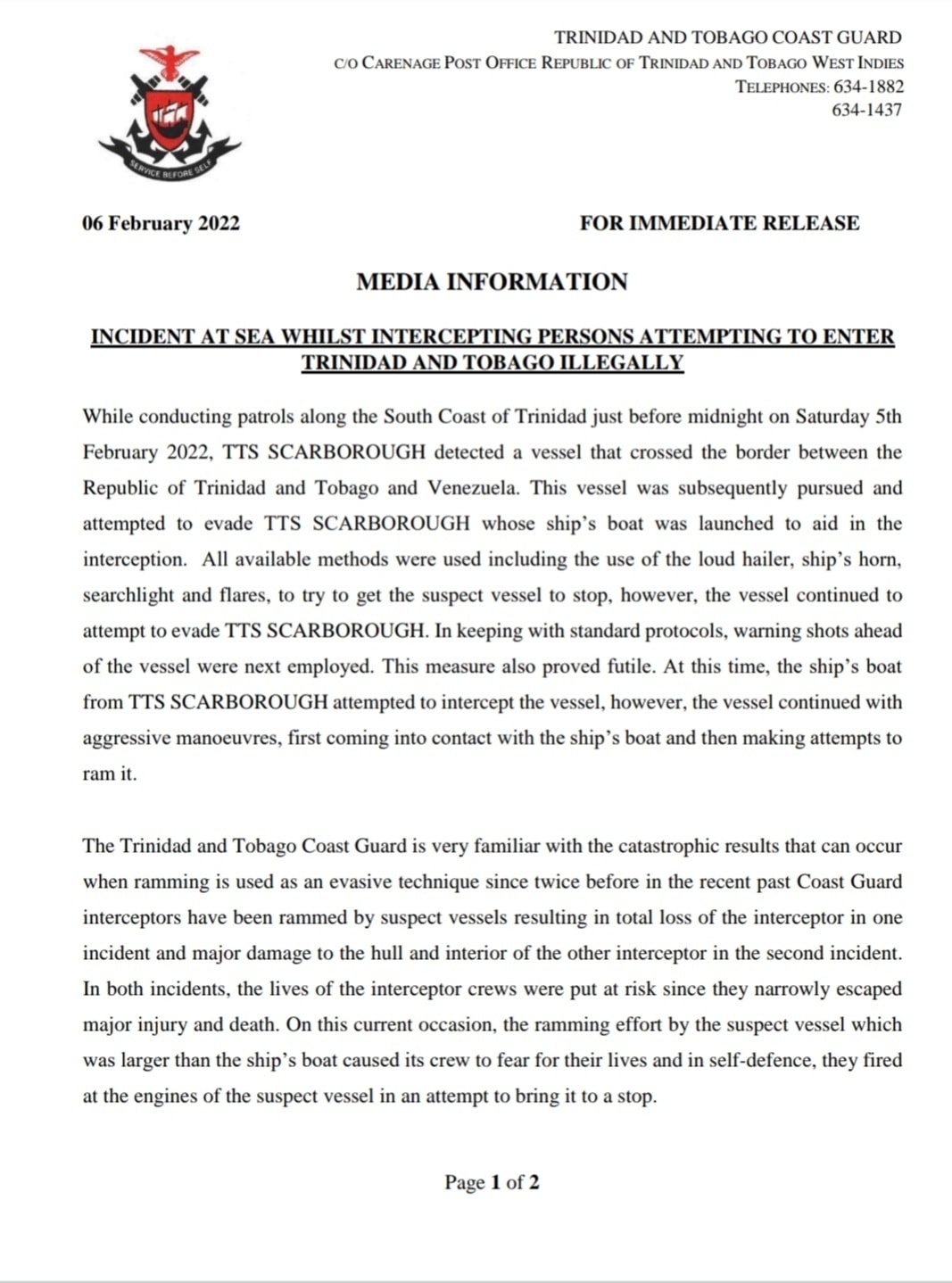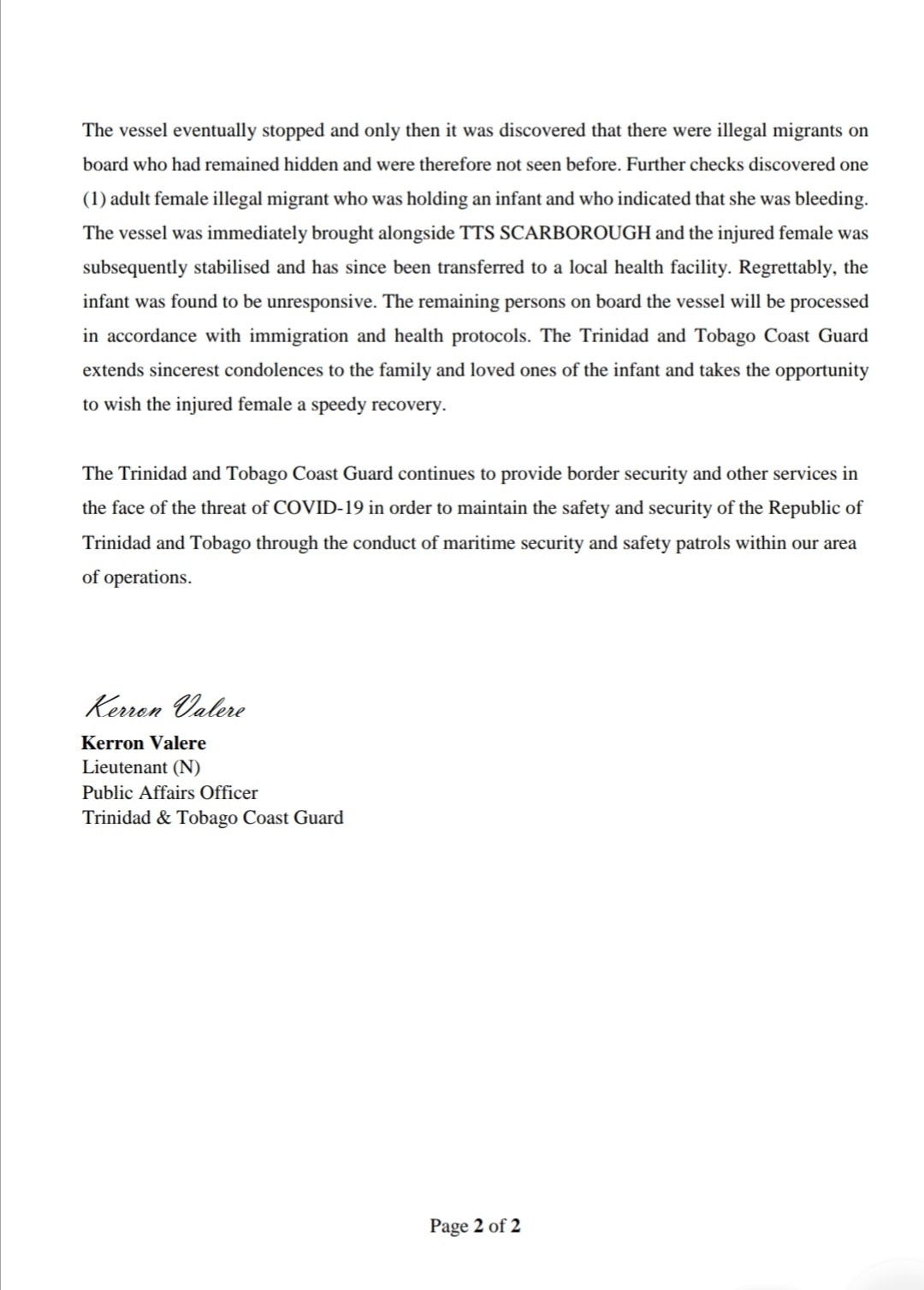 Les gardes côtes de Trinité et Tobago ont clarifié la situation par un communiqué publié sur leur page facebook, le lendemain du drame.