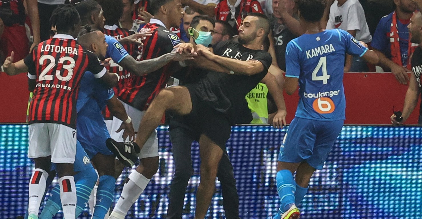 La précédente rencontre le 22 août 2021 avait été interrompue à la suite de jets d’objets et de l’intrusion de spectateurs sur la pelouse. À la 75ème minute, sur un corner marseillais, Dimitri Payet s’apprête à tirer le coup de pied arrêté, mais il est touché dans le haut du dos par une bouteille d’eau lancée depuis la tribune niçoise. Cet événement marquera la fin du match et le début d’un fiasco pour le football français. Pendant plus d’une heure, le chaos va se propager sur la pelouse. Des supporters envahissent le terrain, suivis des gendarmes et des stadiers et de joueurs tentant de séparer les uns ou de pousser les autres.