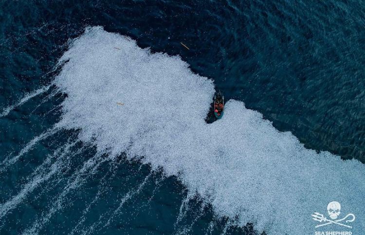 Les photos réalisées par Sea Shepherd, ONG internationale qui lutte contre la pêche industrielle et pour la préservation des écosystèmes sous-marins, révèlent une “mer” de particules scintillantes semblable à de l’écume. Il s’agit en fait de poissons morts flottant à la surface, une centaine de milliers de merlans bleus. Cette espèce est notamment pêchée pour la fabrication des surimis.