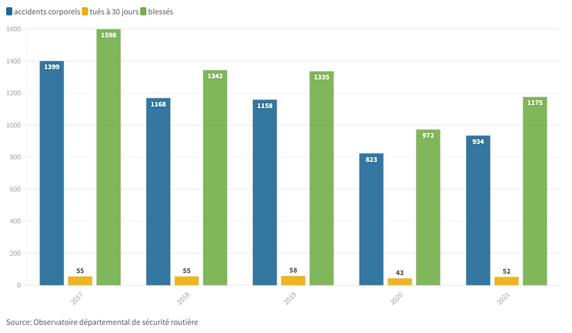 Selon les derniers chiffres de l’Observatoire départemental de sécurité routière le nombre d’accidents de la route a diminué entre 2017 et 2021. Le nombre de morts est lui resté stable.