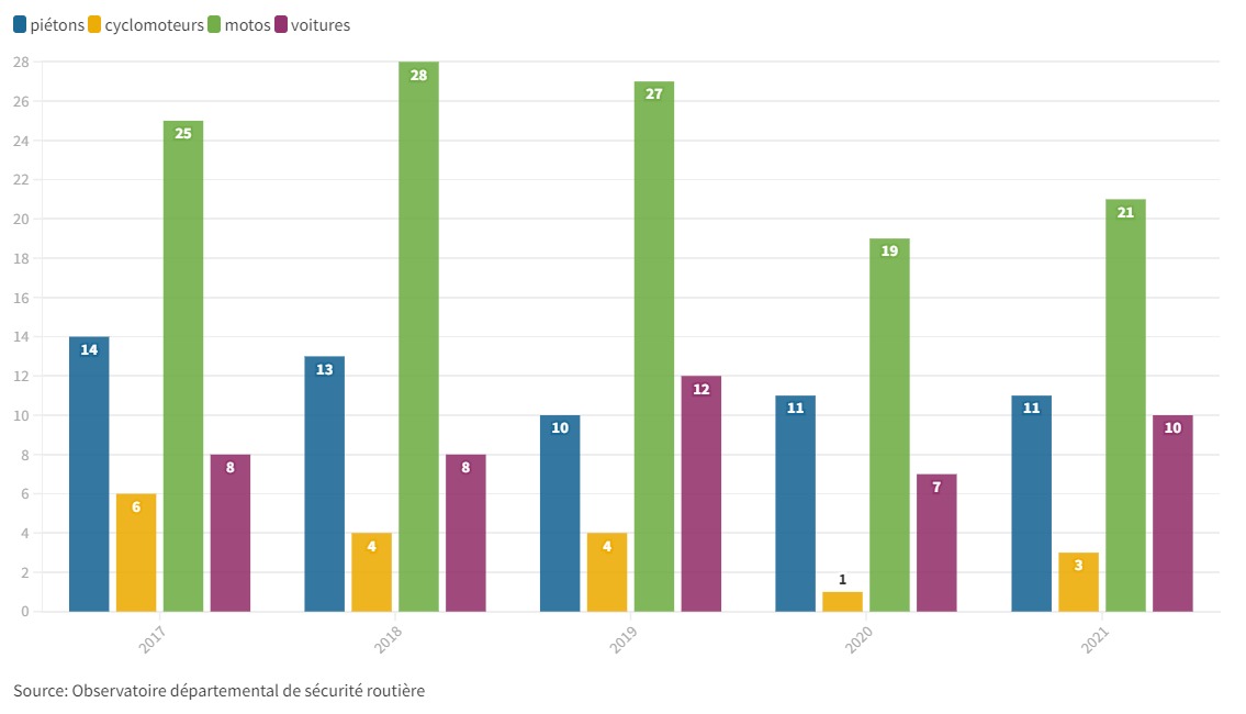 Quelque soit l’année, entre 2017 et 2021 les motards sont toujours les plus nombreux à décéder lors d’accidents mortels. Ils sont environ deux à trois fois plus nombreux à mourir que les automobilistes. En 2017, sur 55 morts, il y avait 25 motards et 8 automobilistes. L’année dernière, sur 52 personnes décédées, 21 étaient des motards et 10 des automobilistes.