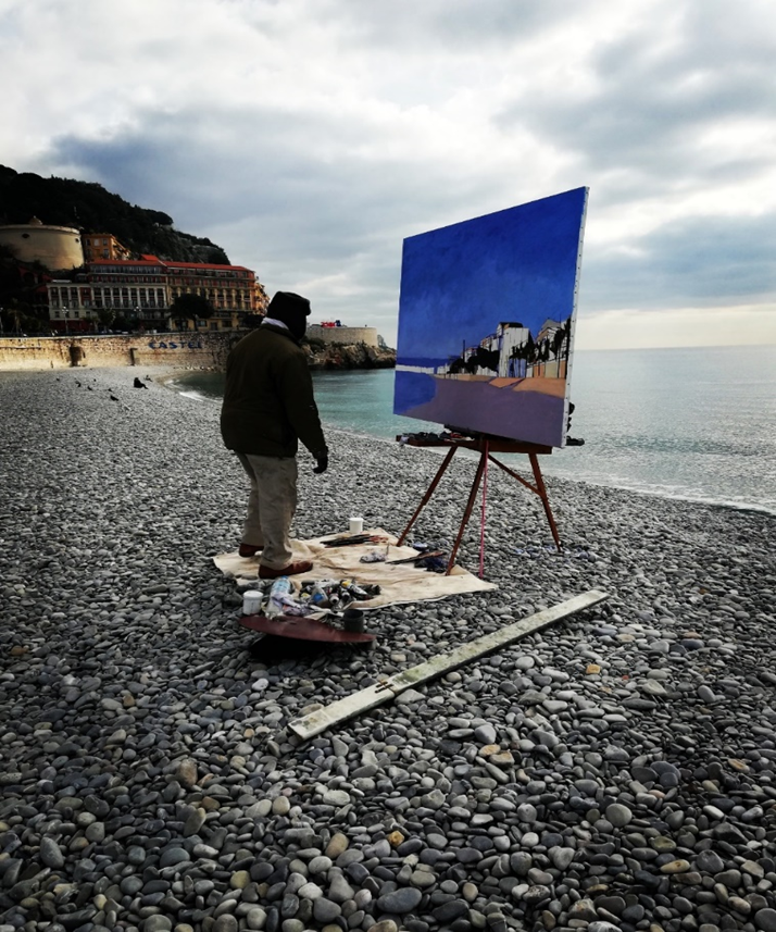 Grâce à son cadre idyllique où mer bleutée et sable clair se confondent, Nice est l’une des destinations les plus prisées au monde. L’activité touristique est le moteur principal de son économie. C’est pourquoi jouir de son accalmie est si sacré. Omar Logang, peintre expérimenté, installe son chevalet dès le début de l’année. La raison qui le pousse à se lever tous les matins aux aurores, c’est le soleil. Cette « lumière » si particulière qu’offre le mois de février, lui propose un paysage unique au travers duquel il puise sa créativité.