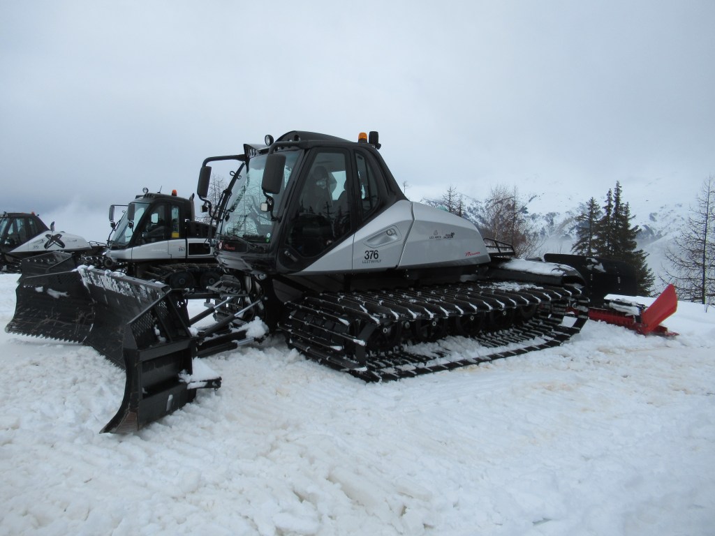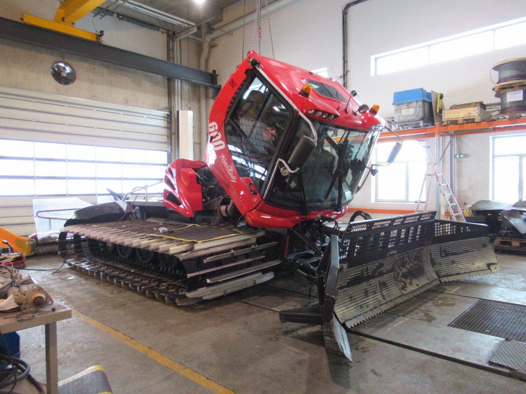 L’entretien aux Arcs, c’est le travail de la dizaine de mécaniciens qui s’occupent de ces monstres en journée et l’été. Au Centre Technique des Deux Têtes, des dameuses éventrées côtoient des motoneiges et des boites étiquetées « Axes pour les chenilles » ou « Roulement pour la fraise ». C’est dans ce monde à part, que se déroulent les petits contrôles quotidiens des dameuses ou les éventuelles grosses réparations qui empêcheraient la dameuse de ressortir une fois les pistes fermées.