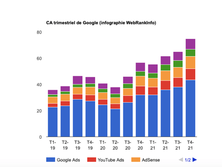 Le cabinet E-Marketer prédit que la croissance de Google va continuer en 2022. La publicité sur le web devrait rapporter plus de 171 milliards de dollars à l’entreprise cette année.