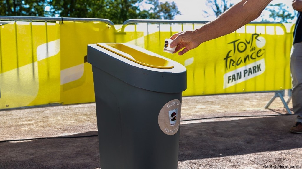 Part de l’identité de la course, la caravane publicitaire distribue chaque année 18 millions de goodies. Depuis deux ans l’utilisation de plastique à usage unique a été proscrit dans le cortège publicitaire, excepté pour les produits alimentaires. Du côté du tri sélectif, quelques 100 000 sacs de tri de différentes couleurs sont distribués tout au long des 24 étapes : “Sur les villes-étapes, on compte environ 3 tonnes de déchets collectés à chaque fois et entre 50 et 55 % partent au recyclage » affirme Karine Bozzacchi du département RSE de Amaury Sport Organisation (ASO). La société organisatrice du Tour de France est également engagée dans un partenariat avec le collectif Les connexions, responsable de la collecte de déchets dans les espaces chargés d’accueillir du public et des professionnels (espaces invités, VIP, espace presse…). Un atelier autour du tri sélectif est aussi dispensé en début du Tour de France aux “suiveurs du Tour” (journalistes, caravaniers, personnels de sécurité, logistique…) afin de les sensibiliser et rendre plus efficace les neufs coordinateurs environnement missionnés, entre autres, pour diffuser des messages autour de l’écologie.