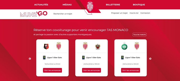 En partenariat avec StadiumGO , le club de la Principauté a récemment fait connaître son nouveau portail de covoiturage, appelé MuneGo. Il s’agit d’une plateforme dédiée au covoiturage pour les nombreux supporters de l’AS Monaco. Et ceux, partout en France. Se rendre au Stade Louis II en covoiturage est dorénavant plus accessible et plus pratique !