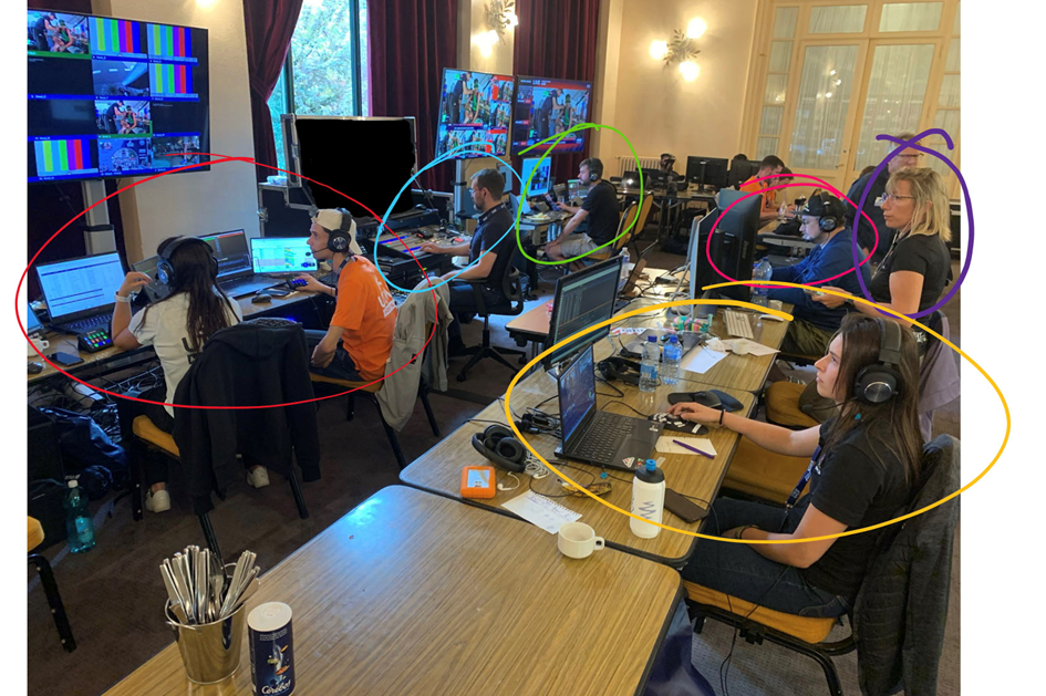En rouge : Gwenaëlle Rabbin et Adrien Fauvet au poste titrage. En bleu : Arnaud Damian au poste de réalisation. En vert : Floris Calori au poste de support terrain et speakers. En rose pourpre : Laurent Montel au motion-design et création de médias. En violet : Isabelle Levionnois au suivi éditorial. En jaune : Eva Guillegault au replay. Photo : Victor Letisse – – Pillon.