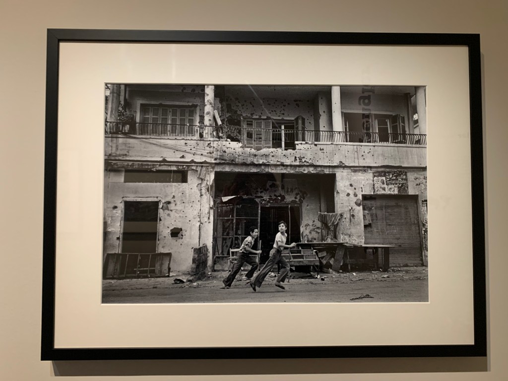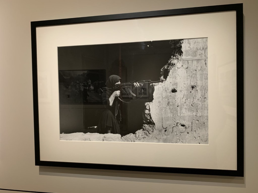 En déambulant à travers cette salle labyrinthique, c’est une énergie sombre qui accompagne le visiteur. L’éclairage, tamisé, enveloppe des photos très noires. Des photos de guerre, de détresse, de mort et de sang. Chacune des femmes exposées montre à sa manière l’horreur de moments de l’Histoire, de la Seconde Guerre mondiale, en passant par la guerre du Vietnam, jusqu’à la guerre en Lybie.