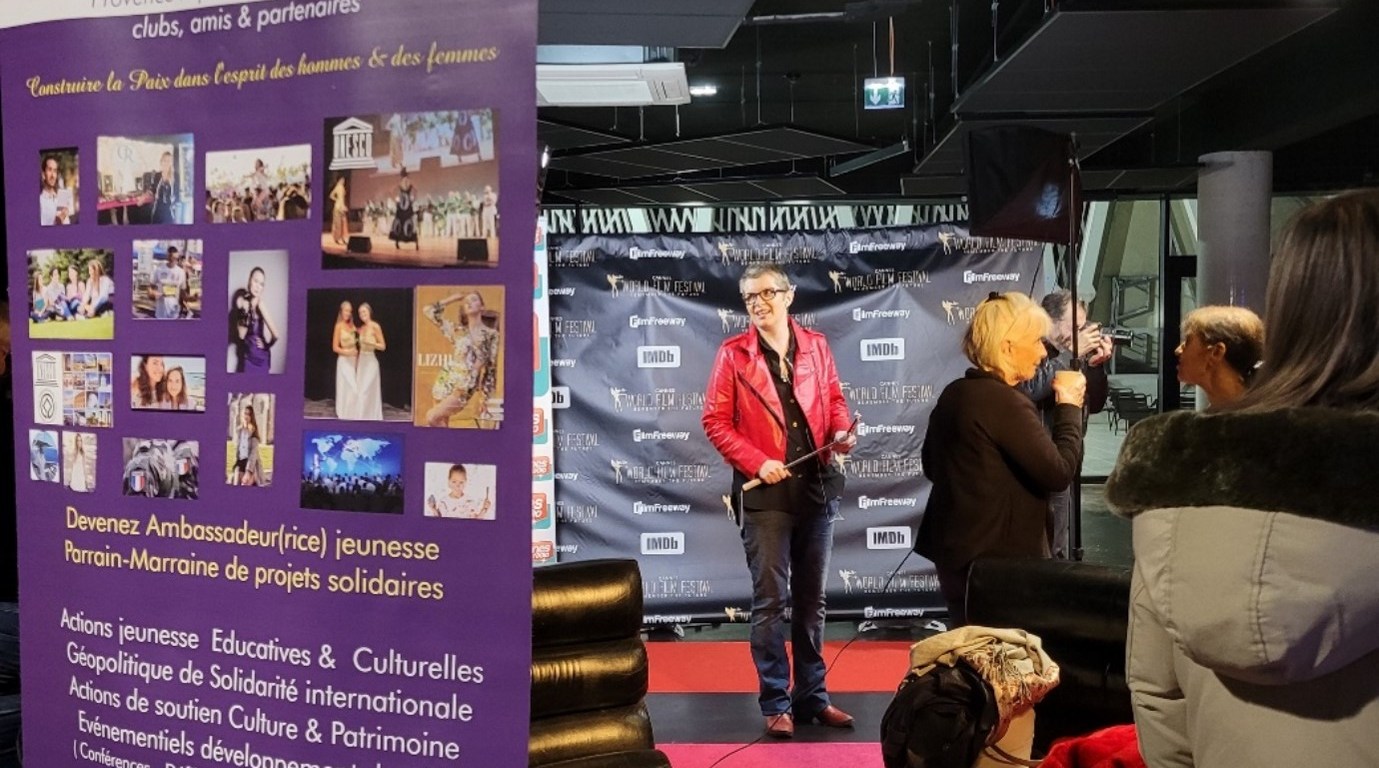 Karolina Bomba (au centre), fondatrice du festival, accueille les spectateurs à la première séance du « Cannes World Film Festival – Remember the Future », au Cineum de Cannes-la-Bocca (photo par Audrey De Quina)