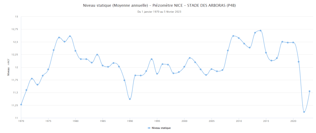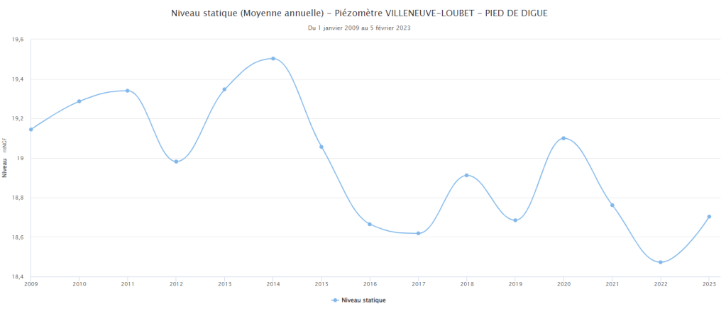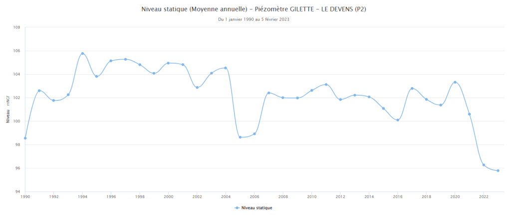 Dans le département, des stations de captage de type « piézomètre » permettent, depuis la surface, d’accéder aux nappes phréatiques. Les données ainsi récoltées montrent que le niveau des nappes phréatiques (mNGF) baisse en moyenne d’année en année.