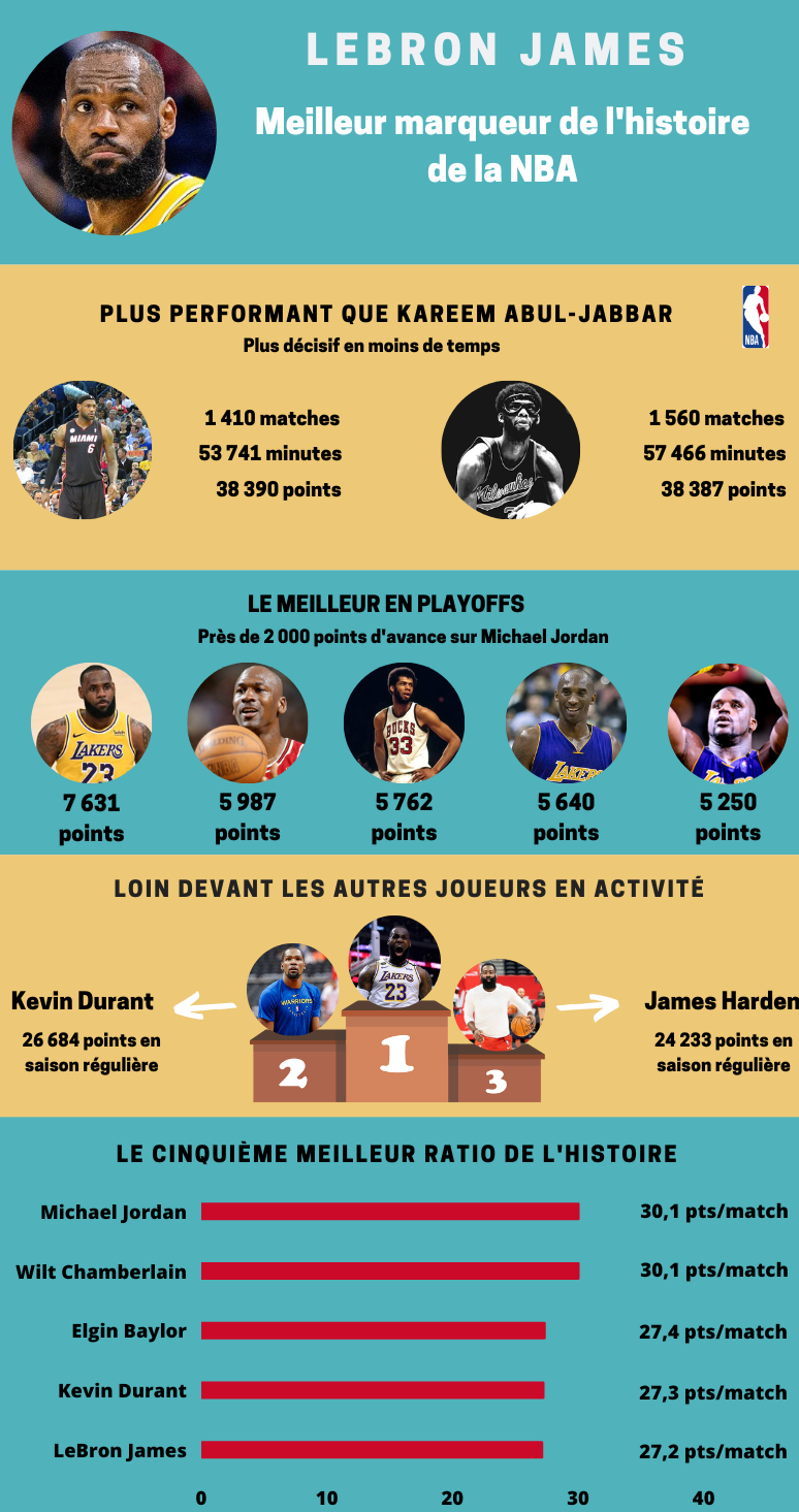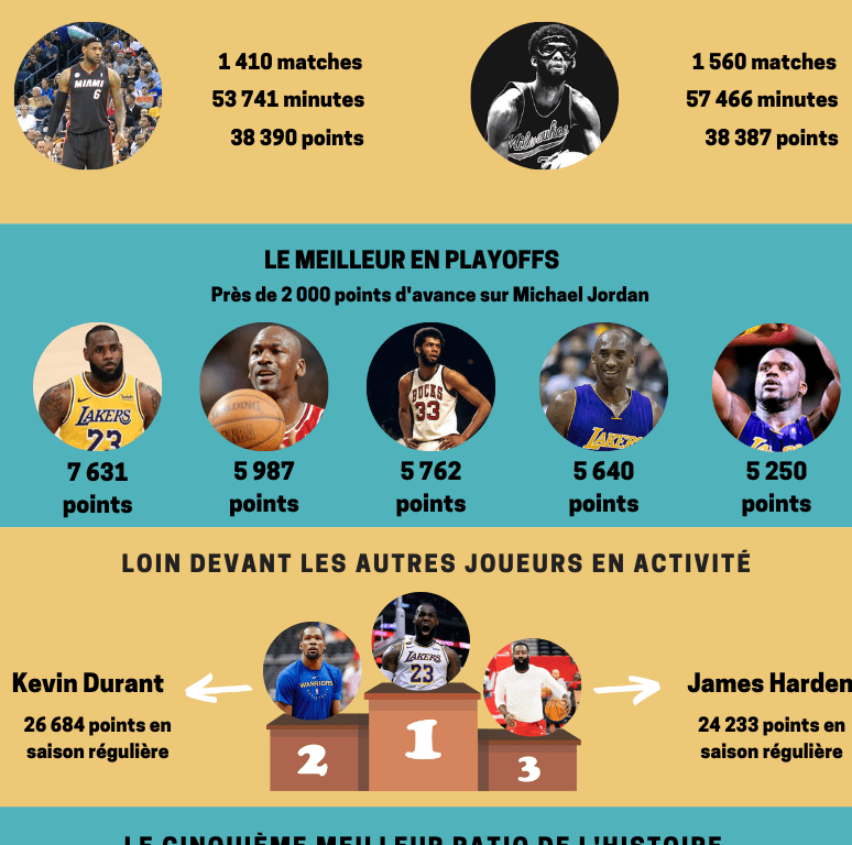 LeBron James continue d’atteindre les plus hautes sphères du basket et de battre les meilleurs scores. En dépassant le record vieux de près de 40 ans d’Abdul-Jabbar, l’ancien joueur de Cleveland ajoute une nouvelle ligne à son palmarès individuel. Déjà recordman du nombre de matchs à au moins 20 points, il est aussi le seul joueur de l’histoire à cumuler au moins 30.000 points, 10.000 rebonds et 10.000 passes, le joueur qui a gagné le plus de matchs ou encore le recordman du nombre de points marqués au All-Star Game.