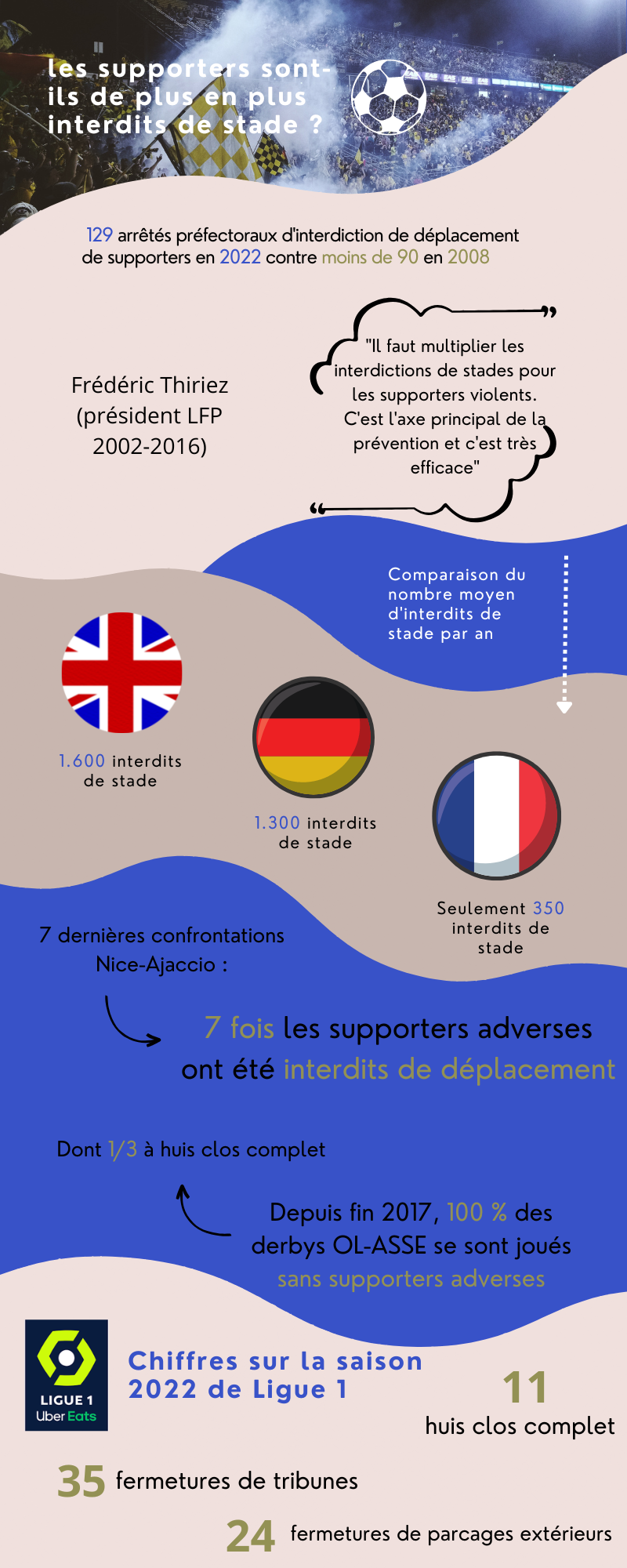 Les supporters de football violents sont de plus en plus sanctionnés par des huis clos ou des interdictions de déplacement. Depuis la loi du 23 janvier 2006, une interdiction administrative de stade peut aussi être délivrée aux supporters récidivistes. Les plus grandes affiches de Ligue 1 sont directement concernées par ces mesures et beaucoup d’entre elles se déroulent sans les supporters visiteurs, voire à huis clos complet.