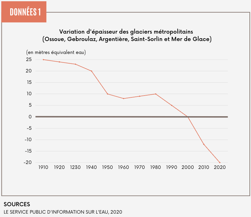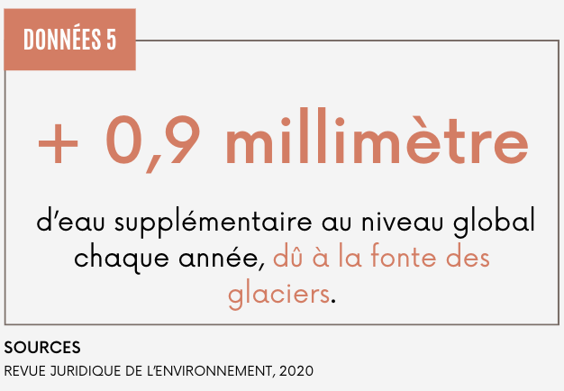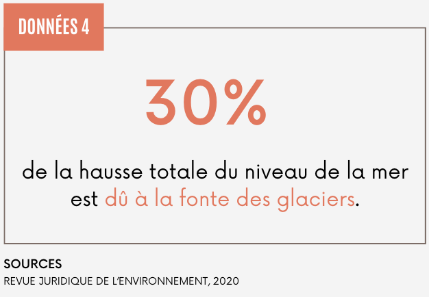 Au niveau mondial, 30% de la hausse totale du niveau de la mer est dû à la fonte des glaciers. Elle génère 0,9 millimètre d’eau supplémentaire au niveau global chaque année, selon Revue juridique de l’environnement, 2020. Depuis 1900, le niveau moyen de la mer s’est élevé de près de 20 cm, d’après «Le service public d’information sur l’eau», 2020. Il est indiqué dans le rapport que «cette élévation est liée à une augmentation des températures océaniques (plus une eau est chaude, plus elle se dilate et occupe de volume) et à la fonte des glaces et neiges.»