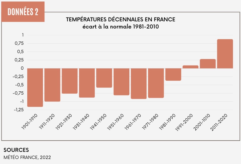 En France comme dans le reste du monde, le climat a une tendance nette au réchauffement depuis 1850. Ce réchauffement n’est pas égal sur l’ensemble de la planète, raison pour laquelle on parle de «dérèglement» climatique. Selon «Le service public d’information sur l’eau», sur l’année 2022, la température moyenne à la surface de la Terre était de +0,65°C, un record depuis le XXe siècle. Sur la même période en France, c’est 0,88°C d’augmentation, selon Météo France. L’année 2022 a été marquée par des phénomènes météorologiques: les épisodes de sables sahariens, le printemps précoce et le deuxième été le plus chaud jamais observé.