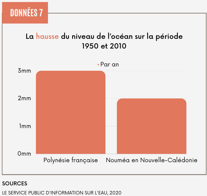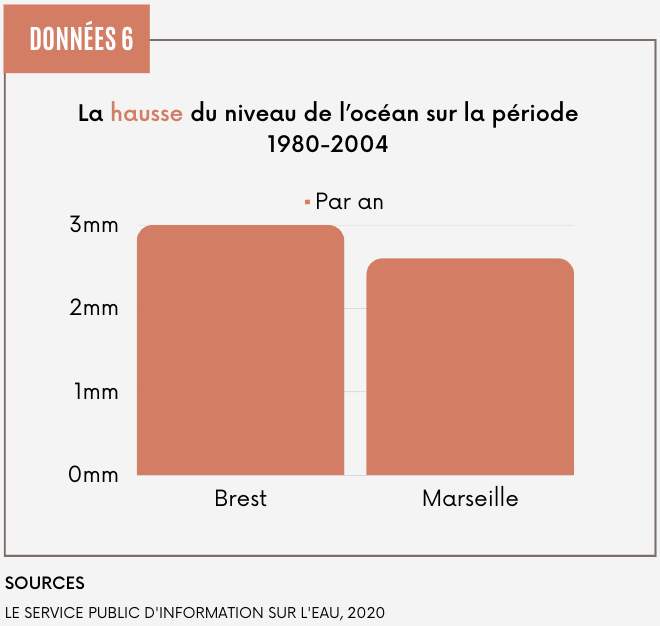 Le territoire français comptabilise 6.000 km de littoral bordant la métropole et ses territoires d’Outre-mer. D’après, «Le service public d’information sur l’eau», 2020. En métropole, la hausse du niveau de l’océan sur la période 1980-2004 a été de 3,0mm/an à Brest et de 2,6 mm/an à Marseille sur la période 1980-2012. En Outre-mer, entre 1950 et 2010, la hausse a atteint 3mm/an en Polynésie française et 2mm/an à Nouméa en Nouvelle-Calédonie.