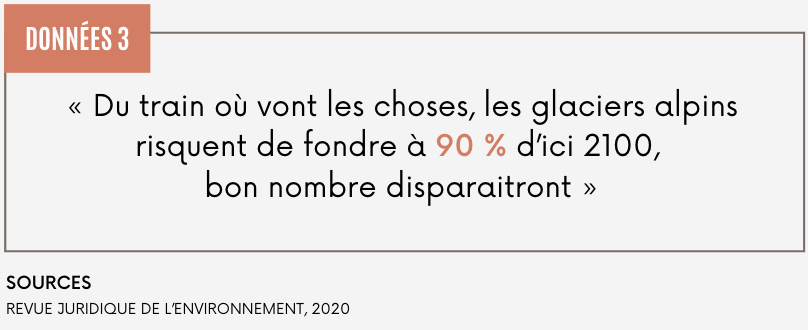 Dans le monde et donc en France, l’augmentation des températures atmosphériques engendre une diminution de la superficie et du volume des glaces de montagne. Sont aussi concernés, la mer, la banquise arctique, la couverture neigeuse et les calottes glaciaires ainsi que le pergélisol (sol gelé en permanence). «La fonte annuelle globale correspondrait actuellement à trois fois le volume de glace stocké dans l’ensemble des Alpes européennes (soit 335 milliards de tonnes)», selon l’étude Revue juridique de l’environnement, 2020.