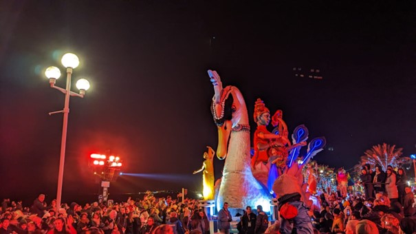 Samedi 11 février à 20h30, 18 000 personnes étaient réunies le long du parcours pour assister au premier corso carnavalesque illuminé de cette édition 2023. Lisa, de passage dans la région pour les vacances avec ses amies, est conquise par l’événement : « On passe une très bonne soirée, tout est très beau ». Elle apprécie surtout la grande diversité des pays représentés par les chars et les artistes, « on découvre plein de costumes, on voyage », s’enthousiasme-t-elle.