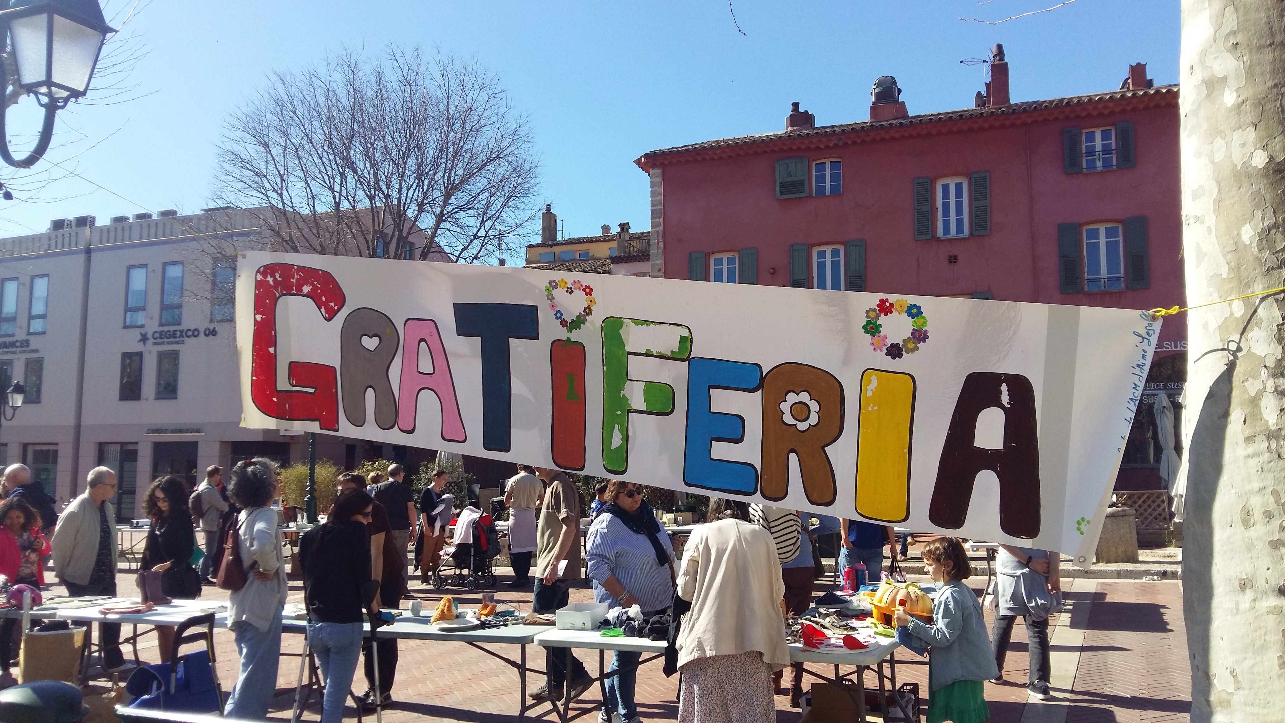 Depuis 2013,une Gratiferia est organisée chaque saison à Mouans-Sartoux. Ces vide-greniers gratuits ont pour but de donner une seconde vie aux objets du quotidien.