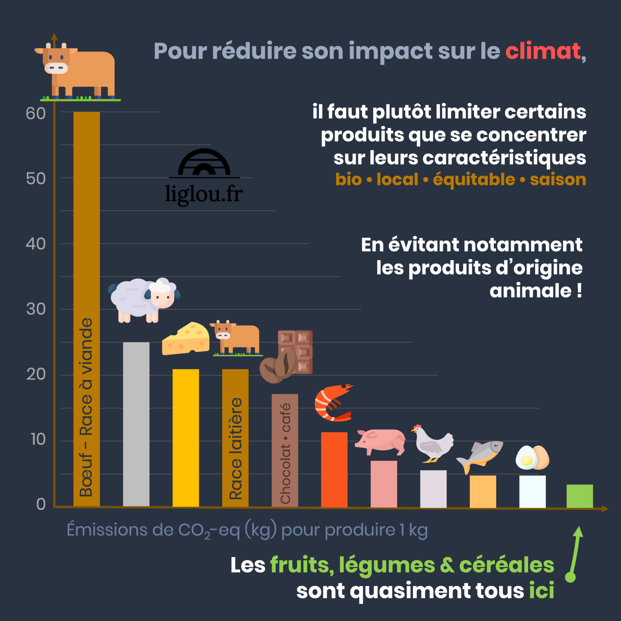 Graphiques montrant l’empreinte carbone de différents produits alimentaires. © L’iglou, à partir de l’étude “Reducing food’s environmental impacts through producers and consumers”, parue dans Science en 2018.