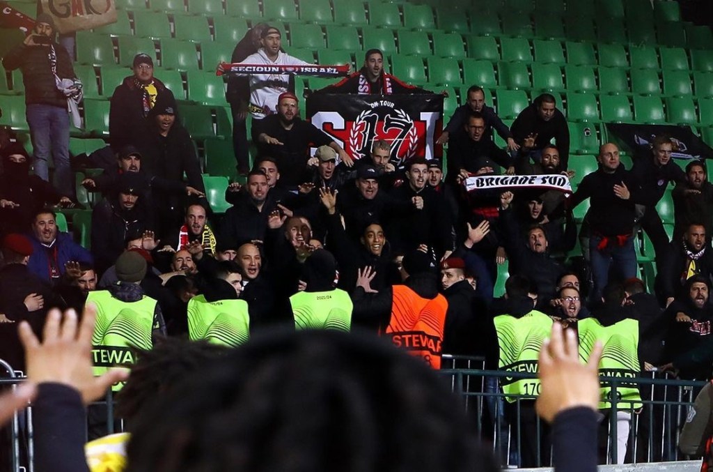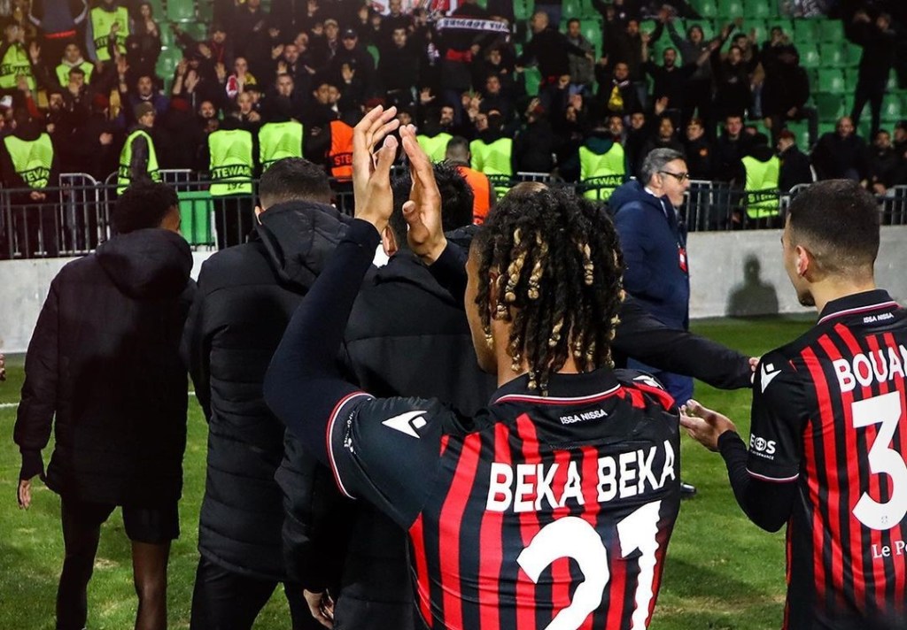 Le Niçois Alexis Beka Beka salue les supporters des Aiglons qui ont fait le déplacement risqué en Transnistrie. Crédit : OGC Nice.