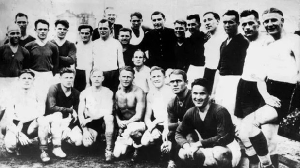 Seconde Guerre mondiale. L’opération « Barbarossa » d’Hitler a pour but d’envahir toute l’URSS. En 1942, l’Ukraine est sous domination nazie. L’envahisseur n’hésite pas à mettre en place un championnat local de football, visant à prouver la « supériorité nazie » dans le sport, à des fins de propagande. Des équipes allemandes, hongroises, roumaines et ukrainiennes s’affrontent. Le FK Start, formation ukrainienne composée d’anciens joueurs du Dynamo Kiev, défie le 6 août la Flakelf, une équipe d’aviateurs de la Luftwaffe. Le résultat est sans appel : 5-1 pour les Ukrainiens. Humiliés, les nazis décident de prendre leur revanche trois jours plus tard. À nouveau, l’équipe basée à Kiev l’emporte (5-3). Quelques jours après, la Gestapo arrête et interroge la plupart des joueurs du FK Start, officiellement pour leurs prétendus « liens » avec la police soviétique, le NKVD. Les représailles s’enchaînent : un mois plus tard, deux joueurs, Tkachenko et Korotkik meurent en prison. Huit autres membres de l’équipe sont déportés au Camp de concentration de Syrets et trois d’entre eux y seront assassinés. Le martyr de ces joueurs, mais surtout civils soviétiques sera instrumentalisé par la propagande stalinienne.