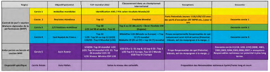 Les 181 athlètes français placés sur les listes ministérielles de haut niveau sont classés dans six catégories différentes, leur octroyant plus ou moins d’aides. La condition pour obtenir un contrat de performance et un soutien par les Maisons régionales de la performance (MRP) est de faire partie du top 32 mondial. Plus l’athlète monte dans le classement, plus il est accompagné. Cependant, il n’y a pas d’indication sur le montant de ces aides. Cette différence de traitement entre les « stars » de l’athlétisme et les autres athlètes de niveau international est assumée par la Fédération.