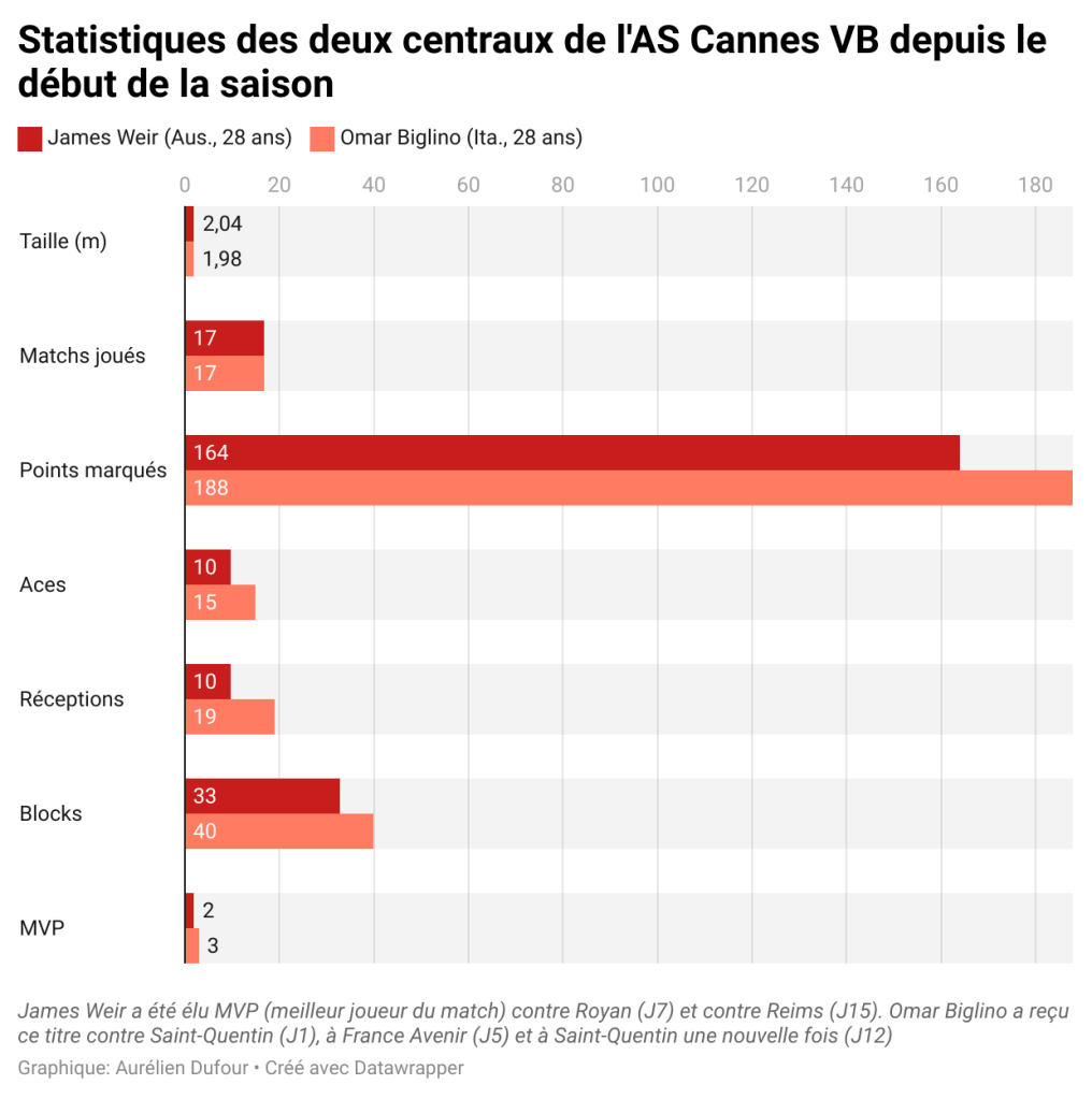 Chez les Dragons cannois, James Weir a pleinement gagné sa place de titulaire aux côtés d’Omar Biglino en central. S’il reste légèrement moins performant que son coéquipier italien (voir infographie interactive ci-dessous), sa présence physique n’en reste pas moins importante. De son côté, Matthew Kemp n’a pas encore gagné sa place dans l’effectif et continue de progresser au centre de formation : “Je comprends qu’avec mon niveau comparé à la forme de l’équipe, me laisser sur le banc est la meilleure solution. J’ai du temps de jeu avec le CFC (Centre de Formation de Cannes). Donc être sur le banc et encourager les copains, c’est ce que je peux faire de mieux pour l’instant. Il n’y a aucun problème pour moi”, assure le jeune Australien.