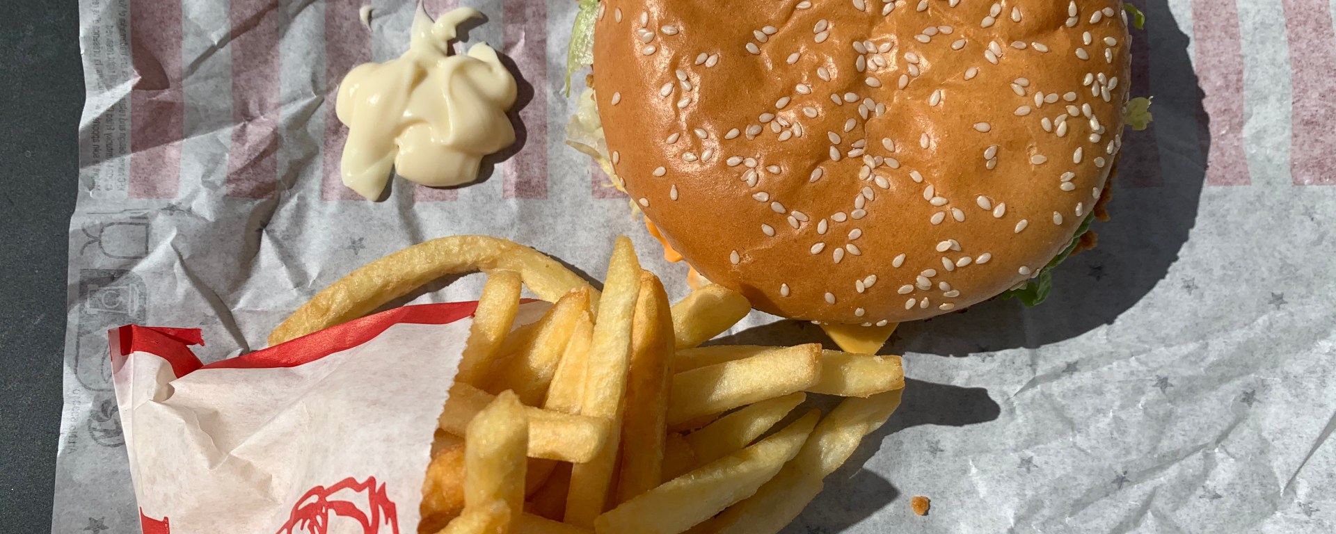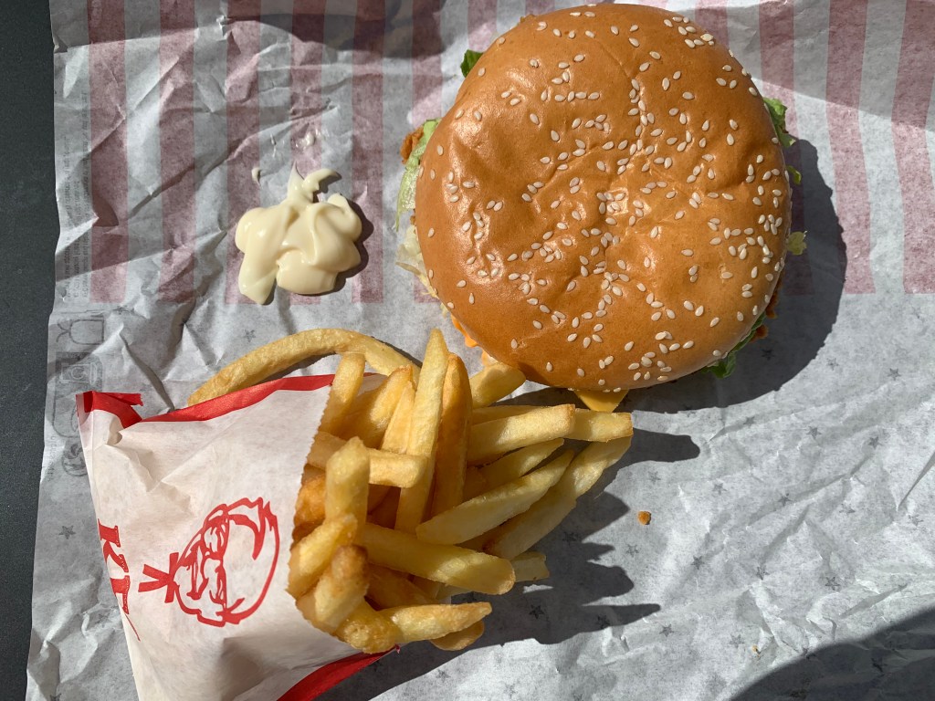 13 h 05. Arrivée au KFC de la gare de Cannes, je commande un colonel original (un sandwich composé d’une pièce de poulet pané, du cheddar, du bacon, de la salade et beaucoup de sauce) avec des frites. Le tout accompagné d’une bouteille d’eau plate. J’ai à peine le goût de la salade. Je paie 9,45 euros. C’est pratique de ne rien avoir à préparer.