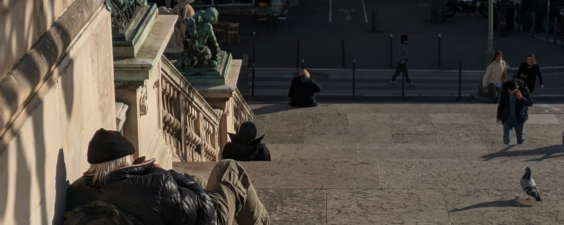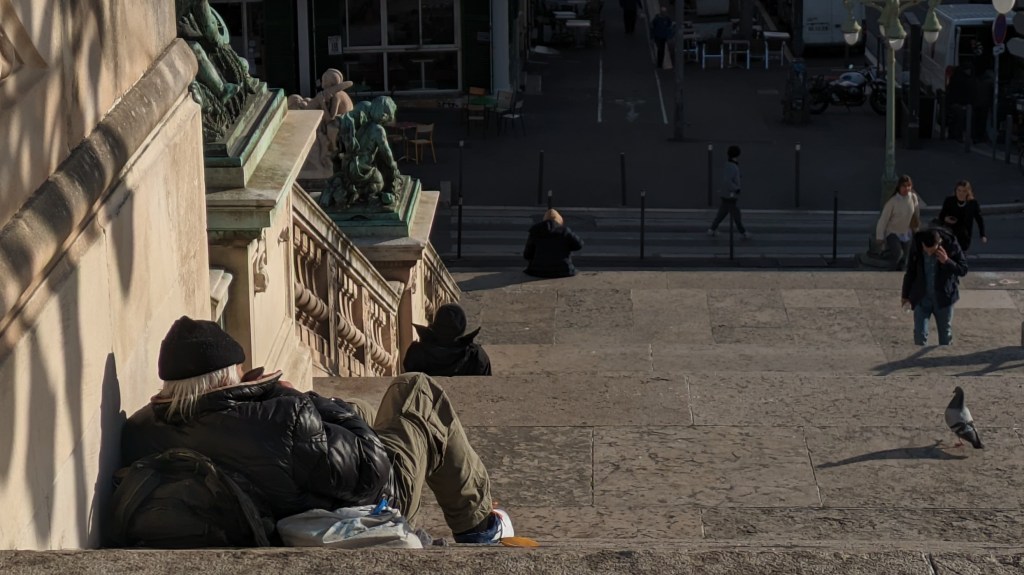 Assis sur une couverture rêche distribuée par une des associations de la ville, il suit du regard un pigeon. Cela fait deux heures qu’il s’est installé sur une des marches de l’escalier monumental de la gare de Marseille. Loin de l’appréhension du train supprimé ou des grèves de la SNCF, il regarde les gens passer : « ils sont souvent pressés, au téléphone, en retard, s’amuse-t-il. Ça me fait sourire parfois. »