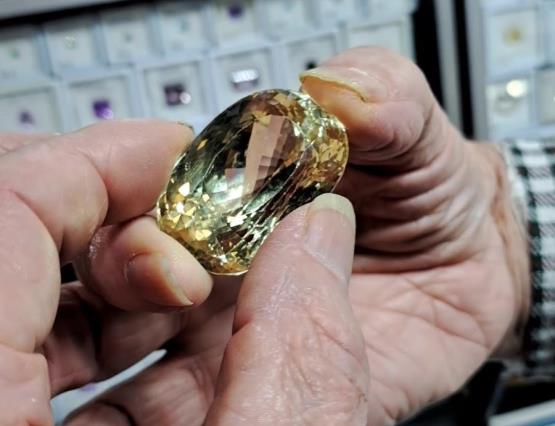 Ce qui n’est pas à la portée de tout le monde en revanche, c’est le joyau d’hiddénite de trois-cents facettes qu’il nous montre fièrement sur son étalage. « Un mois de travail au total », témoigne-t-il, puis montre son étiquette indiquant « 215,95 carats« . Sa création la plus longue, qu’il considère comme « un truc pour les collectionneurs », du fait de sa rareté.