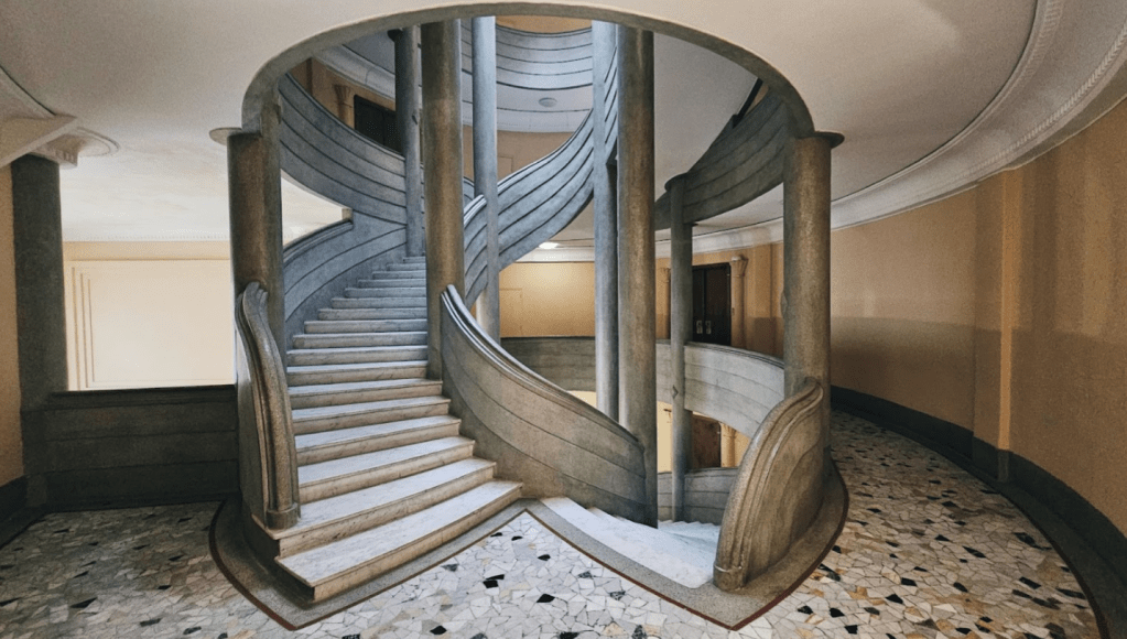 Élément impossible à rater : la cage d’escalier. Elle dessert les différents étages de l’immeuble dans un jeu de courbes qui s’entourent autour de colonnes. Auquel s’ajoute une ouverture en haut de l’édifice.