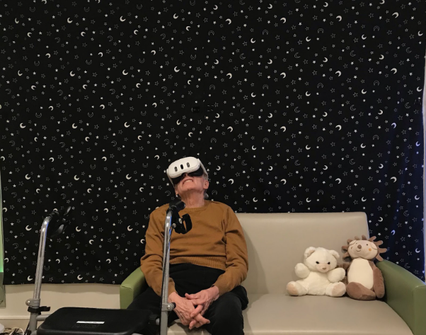 L’atelier commence. Le trentenaire pose quelques questions pour stimuler la mémoire des participants et voir s’ils se souviennent de l’atelier du mois dernier. Il y a cinq personnes dans la salle. « Ce matin, je vais vous montrer des images. Nous allons partir au Portugal », explique-t-il. Le casque de réalité virtuelle est un outil étrange pour les résidents, mais Alexandre Gandon choisit toujours les bons mots pour rassurer son public : « Avec ces lunettes, vous pourrez voir en grand et vous aurez l’impression d’être là-bas. » Les patients peinent à reconnaître l’animateur, même s’il vient les voir régulièrement. Au début, le silence règne dans la salle. C’est un véritable moment de détente pour eux. Les images aux couleurs vibrantes et les explications d’Alexandre Gandon sont une combinaison apaisante pour les seniors. Cet atelier n’est pas seulement de la relaxation. Avec les casques, les seniors peuvent tourner la tête à droite et à gauche pour avoir une vue à 360 degrés des images. Ces mouvements servent à développer la motricité visuelle.