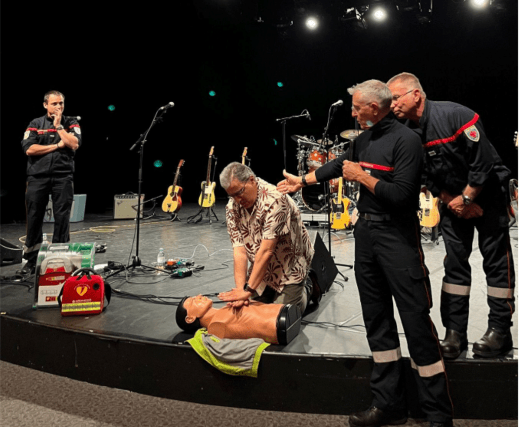 Leur combat contre la mort subite ne se limite pas à la collecte de fonds pour l’achat de défibrillateurs. En effet, le groupe The Low Budget Men forme le public à sauver des vies. En première partie, une brigade de pompiers des Alpes-Maritimes a détaillé les gestes d’urgence à entreprendre pour sauver une personne victime d’un infarctus. Pour la démonstration, deux volontaires choisis dans la salle ont simulé la situation sur un mannequin. Étape par étape, ils ont appliqué les conseils des pompiers sous le regard attentif du public. Au bout d’une trentaine de minutes, l’audience était formée aux gestes de premiers secours. Chaque année, plus de 50 000 personnes sont victimes d’un arrêt cardiaque en France, selon le ministère de la Santé. Parmi elles, plus de 20 000 pourraient être sauvées si un nombre suffisant de défibrillateurs était à disposition et que les gestes d’urgence étaient acquis. À la fin du concert, la brigade de pompiers était présente pour répondre aux questions du public. « Ils sont présents avant chacun de nos concerts », livre Claude Mariottini. » Nous travaillons ensemble depuis sept ans. L’objectif est de véhiculer un message et de former le public à agir. »