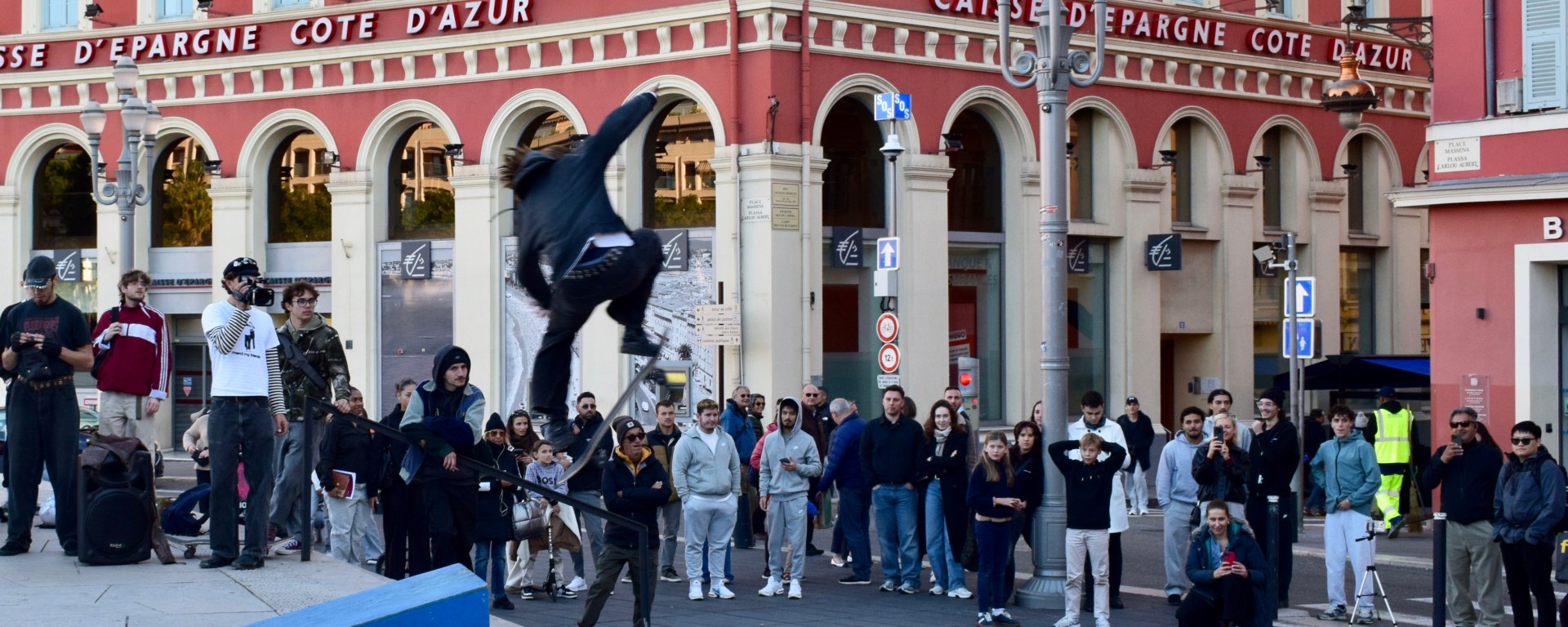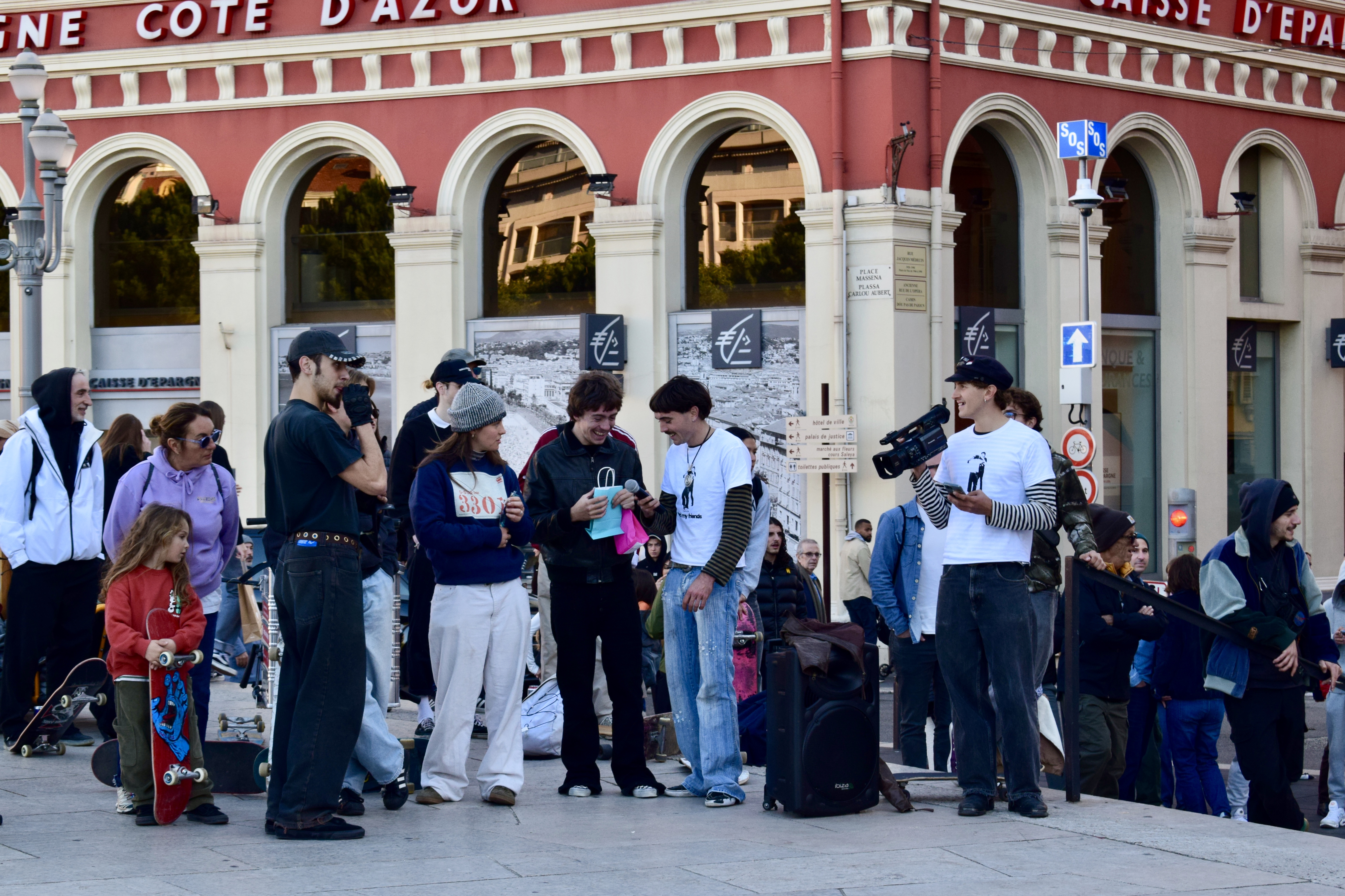 Une vingtaine de personnes se sont réunies à Nice sur la place Masséna le samedi 22 novembre 2025, pour un spectacle de skateboard. Un évènement organisé par Azur Skateboard Club afin de briser les barrières sociales.